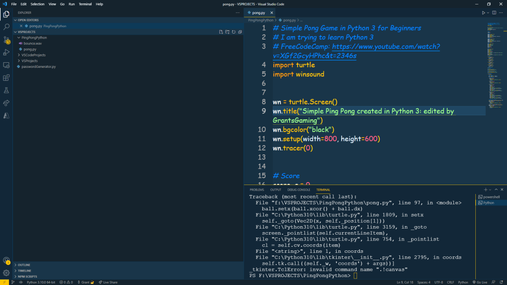 Learning Python 3 games like Ping Pong was simple, it took about an hour or two to code that I followed from a youtube (FreeCodeCamp).I do have the link of the freecodecamp video in the code. It was pretty neat to learn.